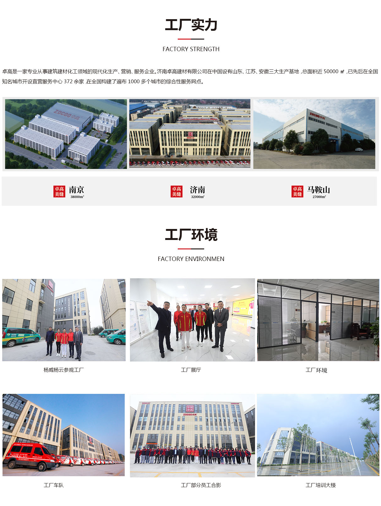 卓高公司成立于2012年2月7日,总部坐落于山东省会泉城济南,是一家集美缝产品的研发、生产、销售、施工服务于一体的全产业链公司。 卓高始终以“追求卓越,志存高远”为企业的核心理念,在业内率先实现流程化、标准化、规模化、品牌化运营的转型升级。卓高致力于用心、专注生产好每一款产品,让每一位消费者用上优质产品,享受优质服务。卓高坚持初心,牢记使命:让平凡的人成就不平凡的人生;让平凡的人在城市里生活的有尊严,加入卓高,成就您富足、快乐、健康的人生梦想!